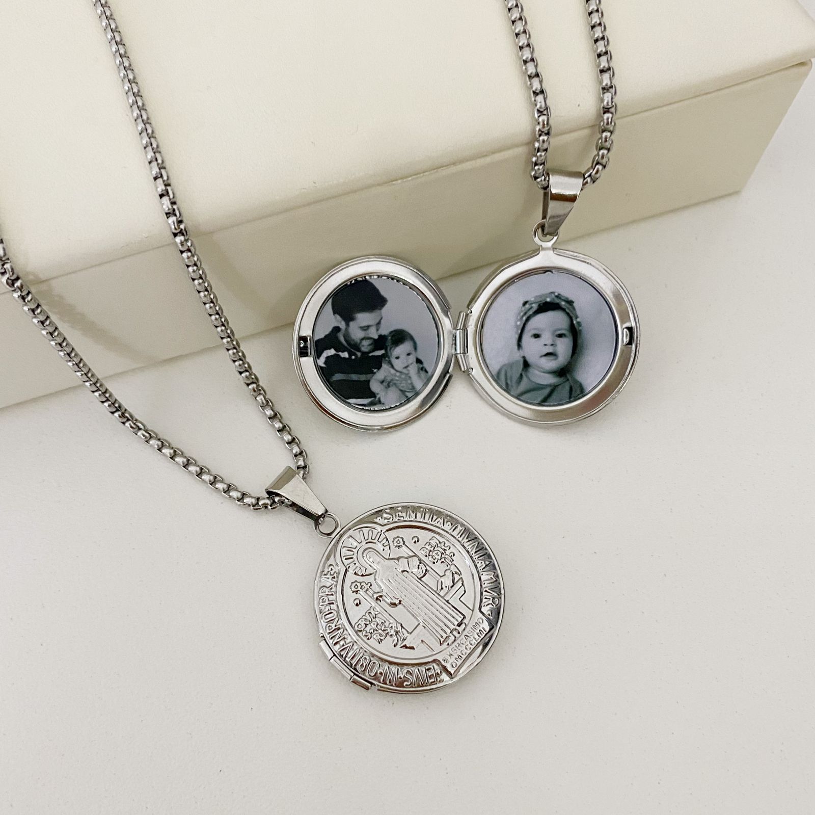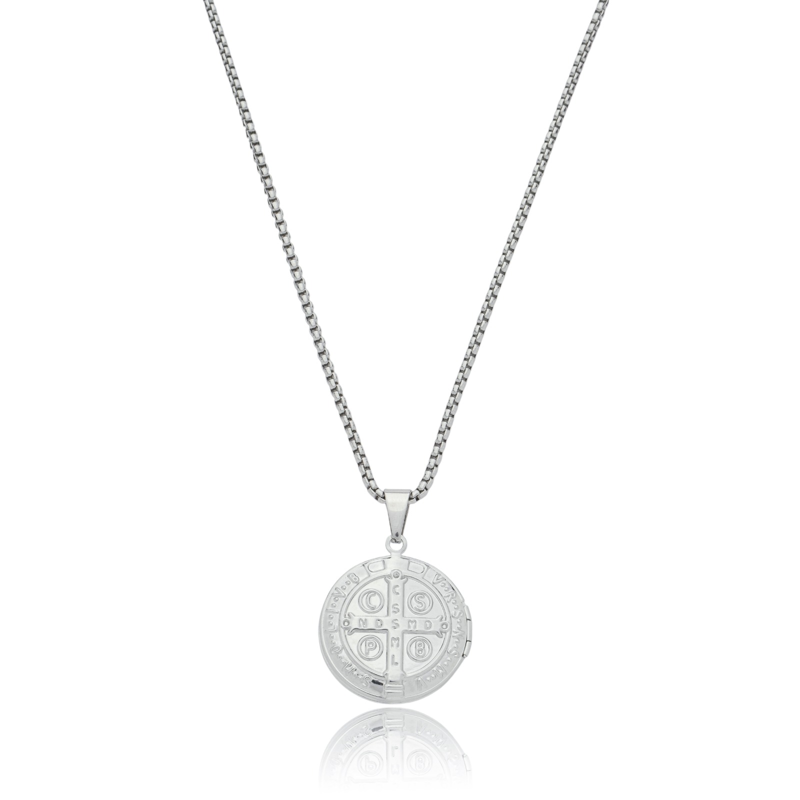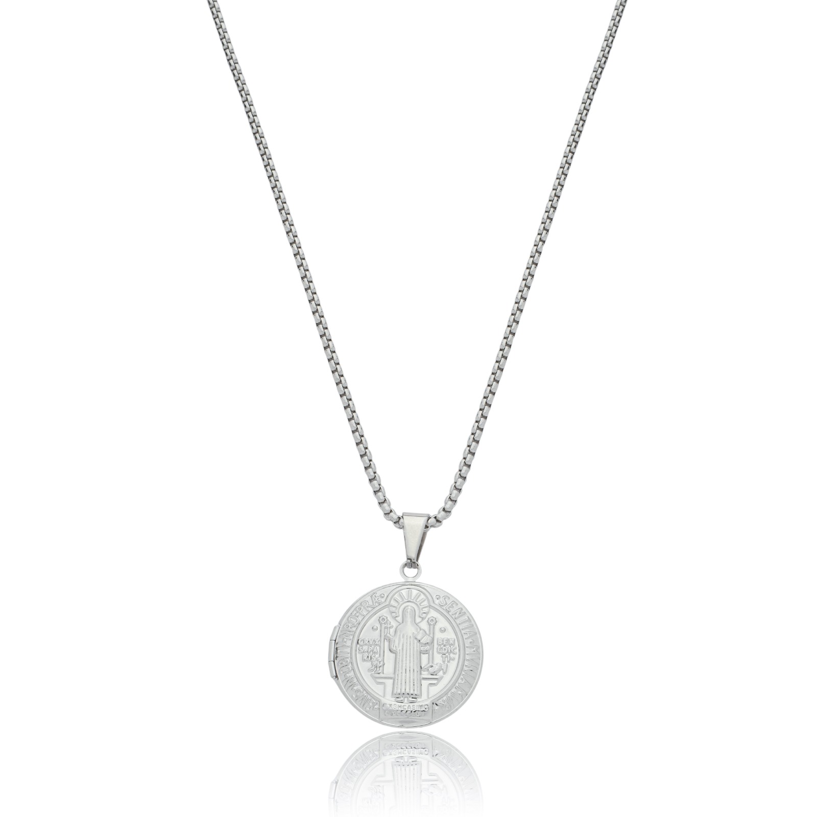 Peça em aço. Pingente Medalha de São Bento. Tamanho do pingente 2,4 cm de diâmetro, altura total de 3,4 cm incluindo passa-fio. Corrente elos venezianos 2 mm com 60 cm de comprimento + 5 cm de extensor. 1 Ano de Garantia. FOTOS INCLUSAS: envie a foto no campo especificado.