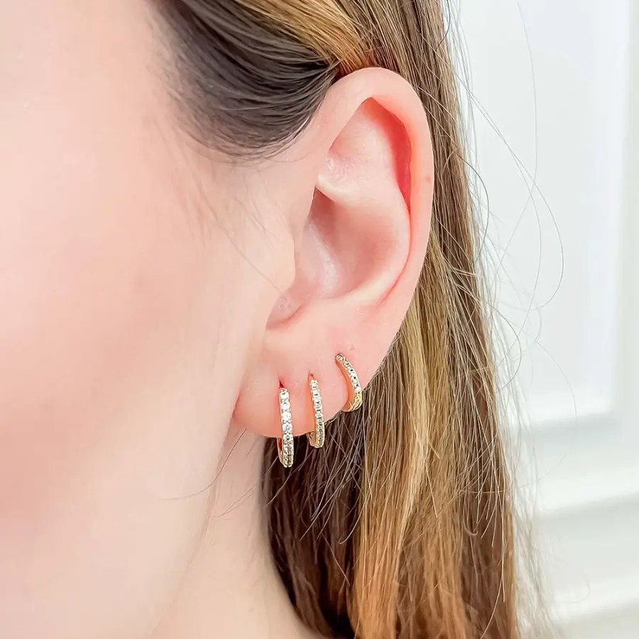 Brinco semijoia com banho de ouro 18k. Kit de 3 pares de brinco argola nos tamanhos 9mm, 11mm e 13mm de altura x 2 mm de largura. Face frontal com 1 fileira de zircônias brancas. Fecho clique. 1 ano de garantia.