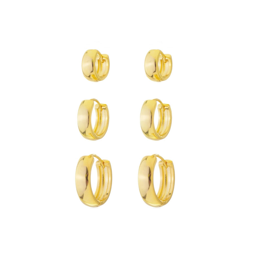 Brinco semijoia com banho de ouro 18k. Kit de 3 pares de brinco argola lisa nos tamanhos 12mm, 16mm e 18mm de altura x 5 mm de largura. Fecho clique. 1 ano de garantia.
